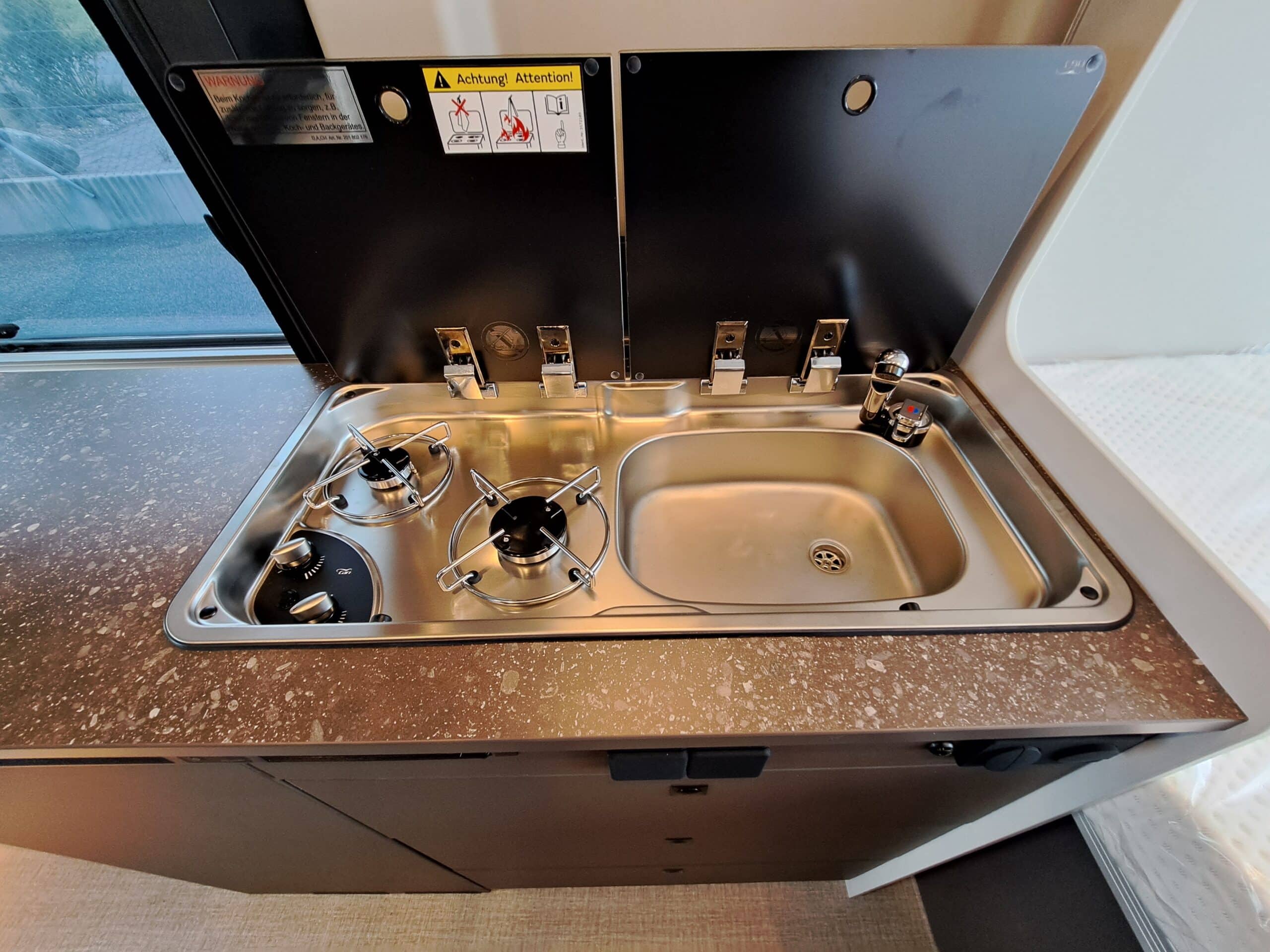 • 2-Flammen-Kocher mit integrierter Spüle und separater Glasabdeckung