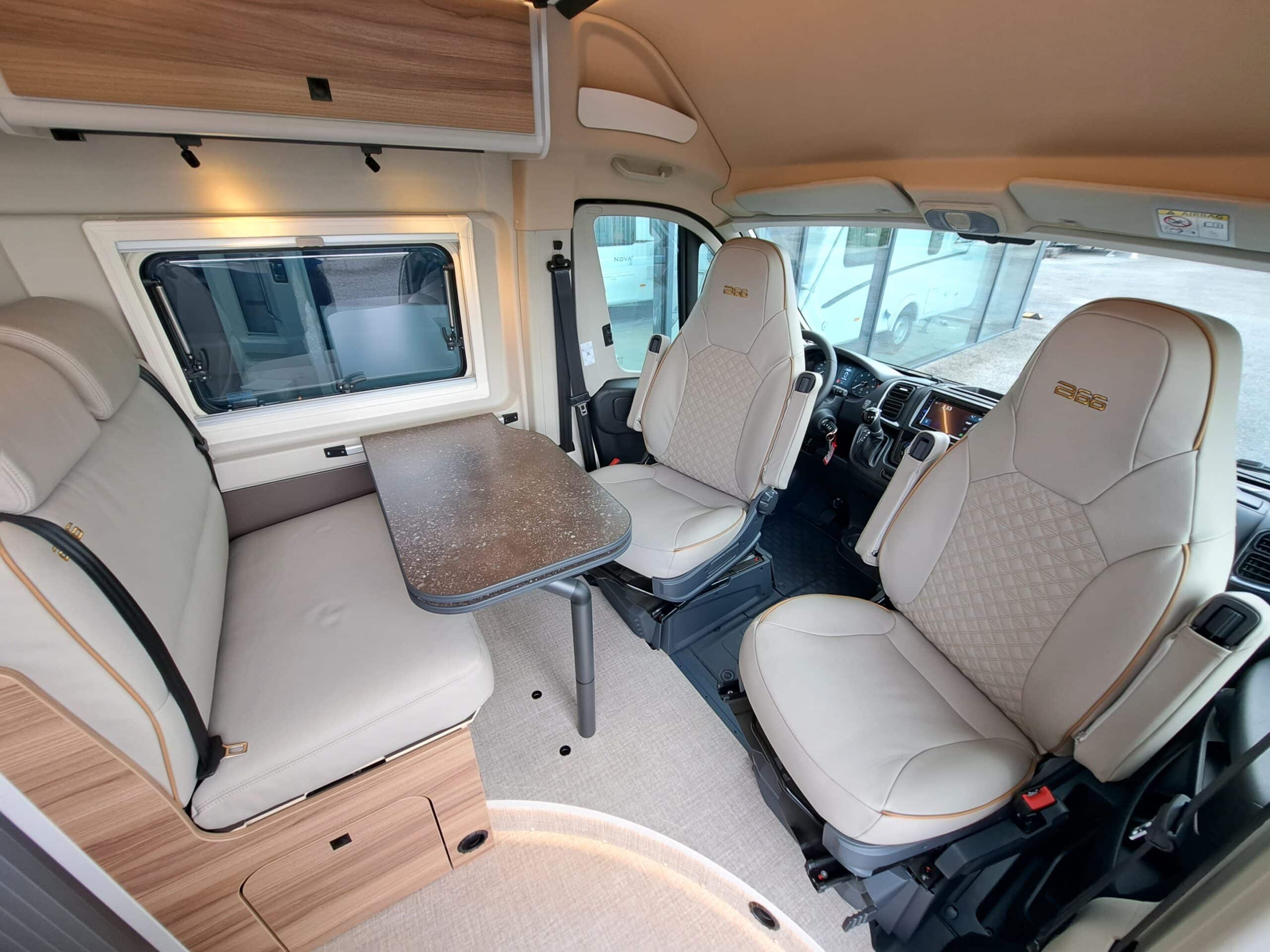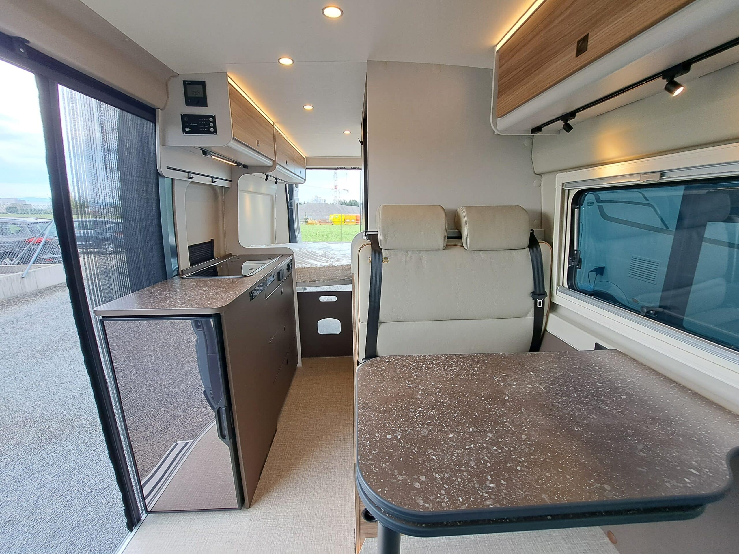 • Fahrersitz und Beifahrersitz in Wohnraumstoff
